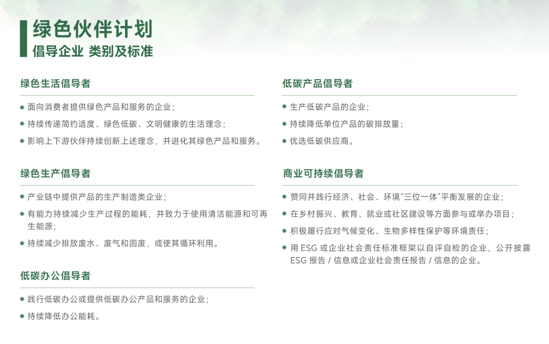 “绿色伙伴”服务于提升企业美誉度,包含“倡导企业”和“标杆企业”等2类8项标准。企业绿色发展(海口)研究院联合来自可持续商业领域的研究和产业专家,参考国际标准、国家标准、行业标准、《企业碳评价标准》、《低碳办公评价标准》等团体标准进行评估和授权。