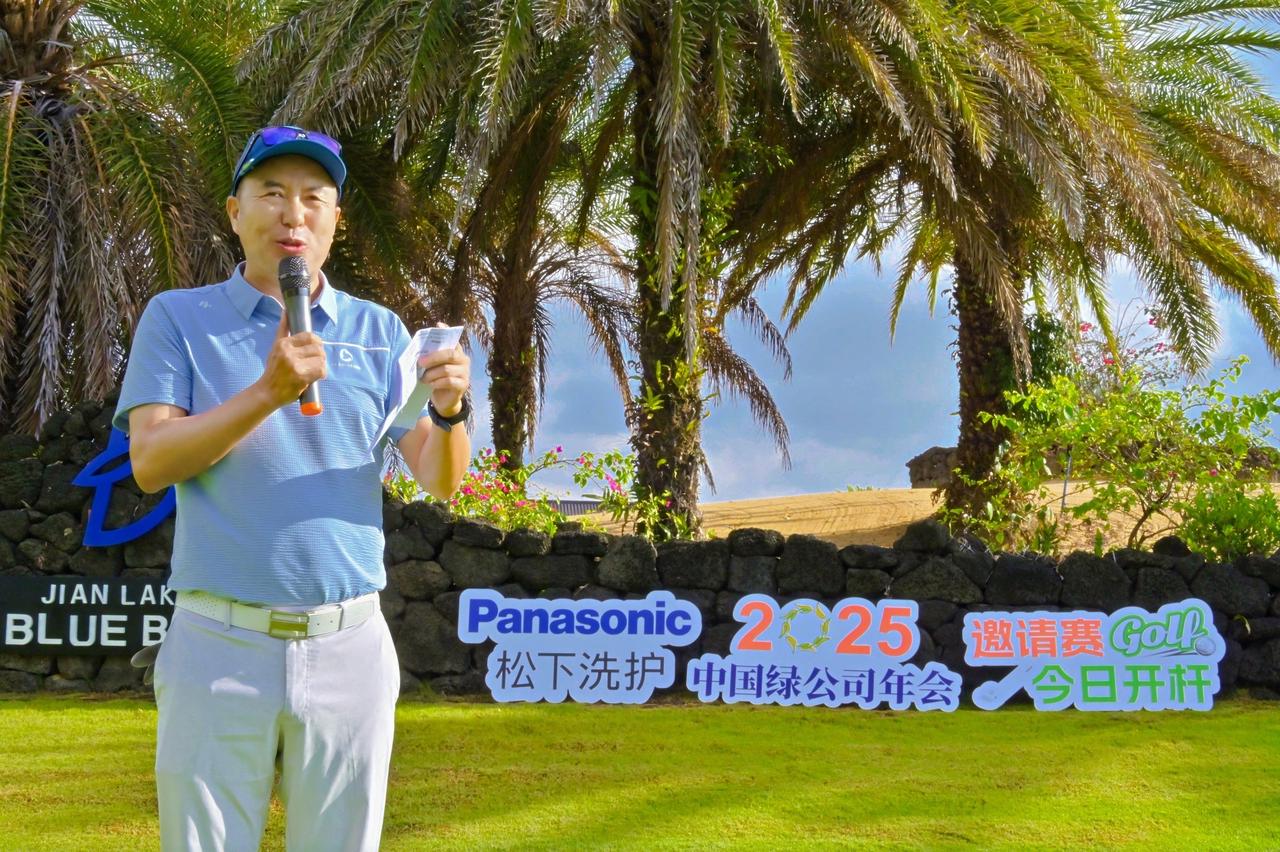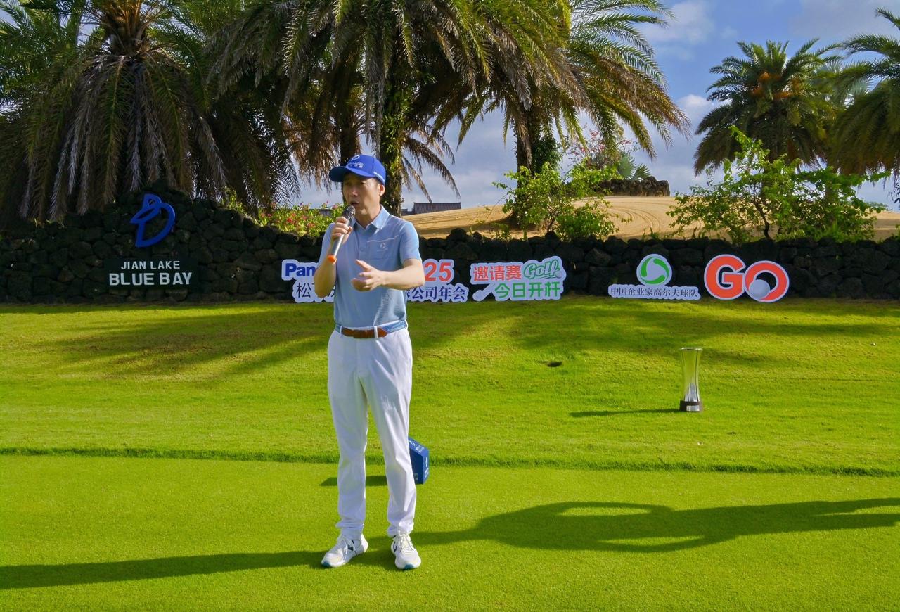 中国企业家高尔夫球队副队长游爱国介绍本次赛事奖项设置,两日皆为个人比杆赛,以第一天成绩产生个人净杆前三;两天个人总杆成绩加总产生本站总冠军、亚军、季军;另设置最远距离&最近距离奖。颁奖时如获奖队员不在场,奖项保留,奖品顺延到下一站活动做抽奖使用;总杆、净杆、单项奖不同时获奖,如同时获奖,取名次高的奖项。请大家严格遵守中国企业家高尔夫球队行为规范,保持绅士风度。最后,特别感谢Panasonic松下洗护赞助支持的智能科技生活家电产品。